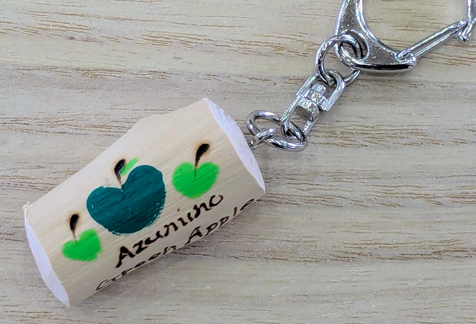 安曇野産リンゴの木をアップルサイクルしたこのキーホルダーは、青々とした安曇野産の青リンゴをモチーフにしており、同じ形はない自然の枝を活かした一点ものデザインが特徴です。